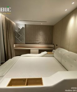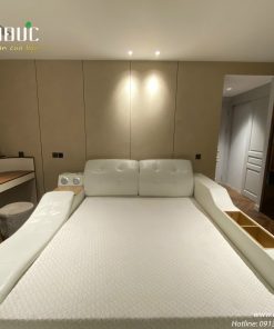 Không gian phòng ngủ master với chiếc giường khổ lớn độc đáo, được bọc da và dát vàng cao cấp